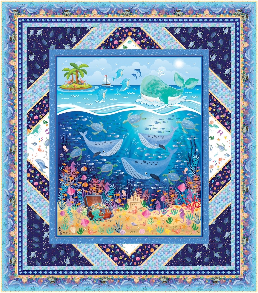 Available January 2026! 57 1/2″x 65 1/2″ Toddler quilt. Swim with me collection from Benartex