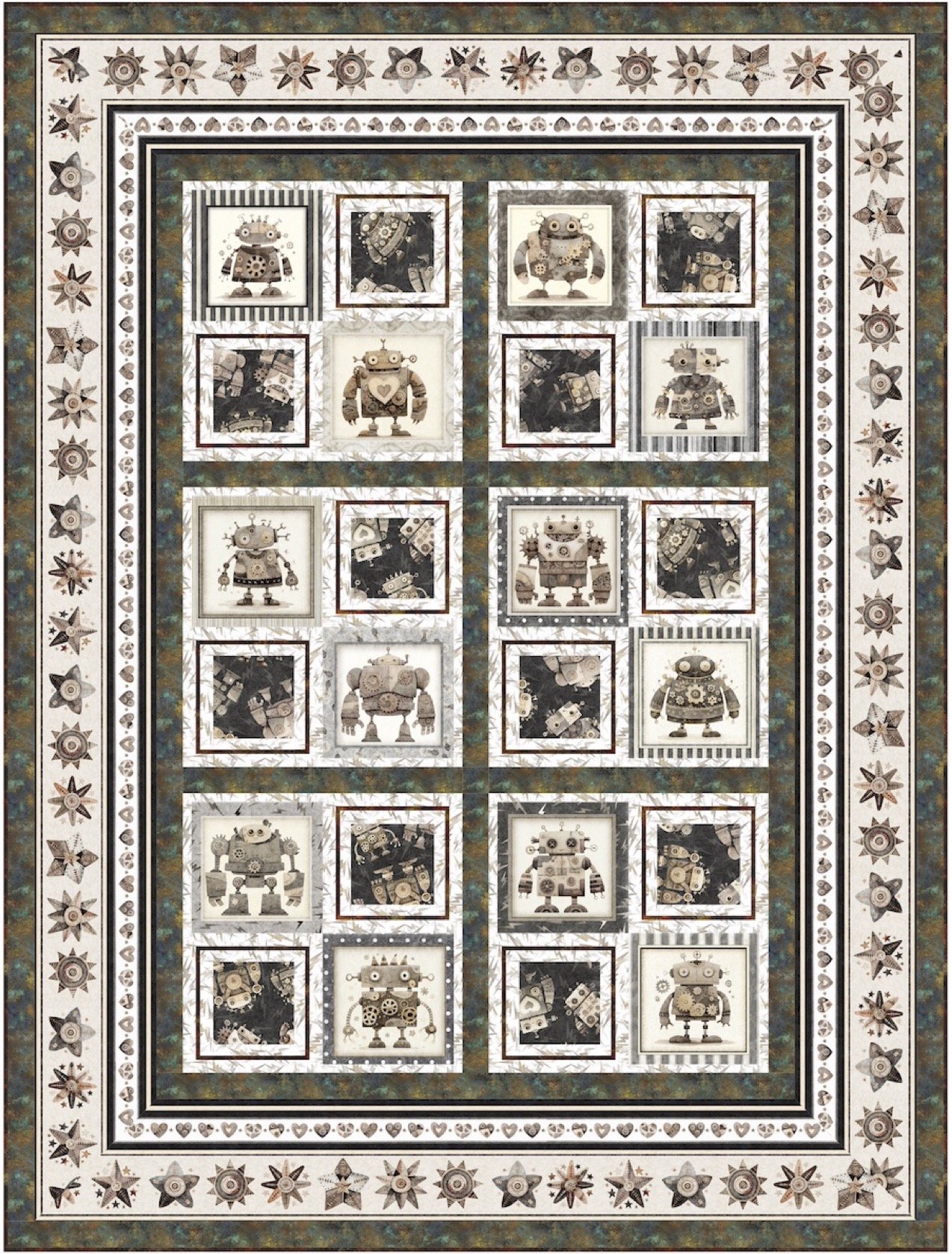53 1/2″ x 71″ throw quilt. A strip set and strips make the large blocks in this throw, No seams to match. So easy! Fabrics from the SewBots collection by QT Fabrics. Skill level: confident beginner.