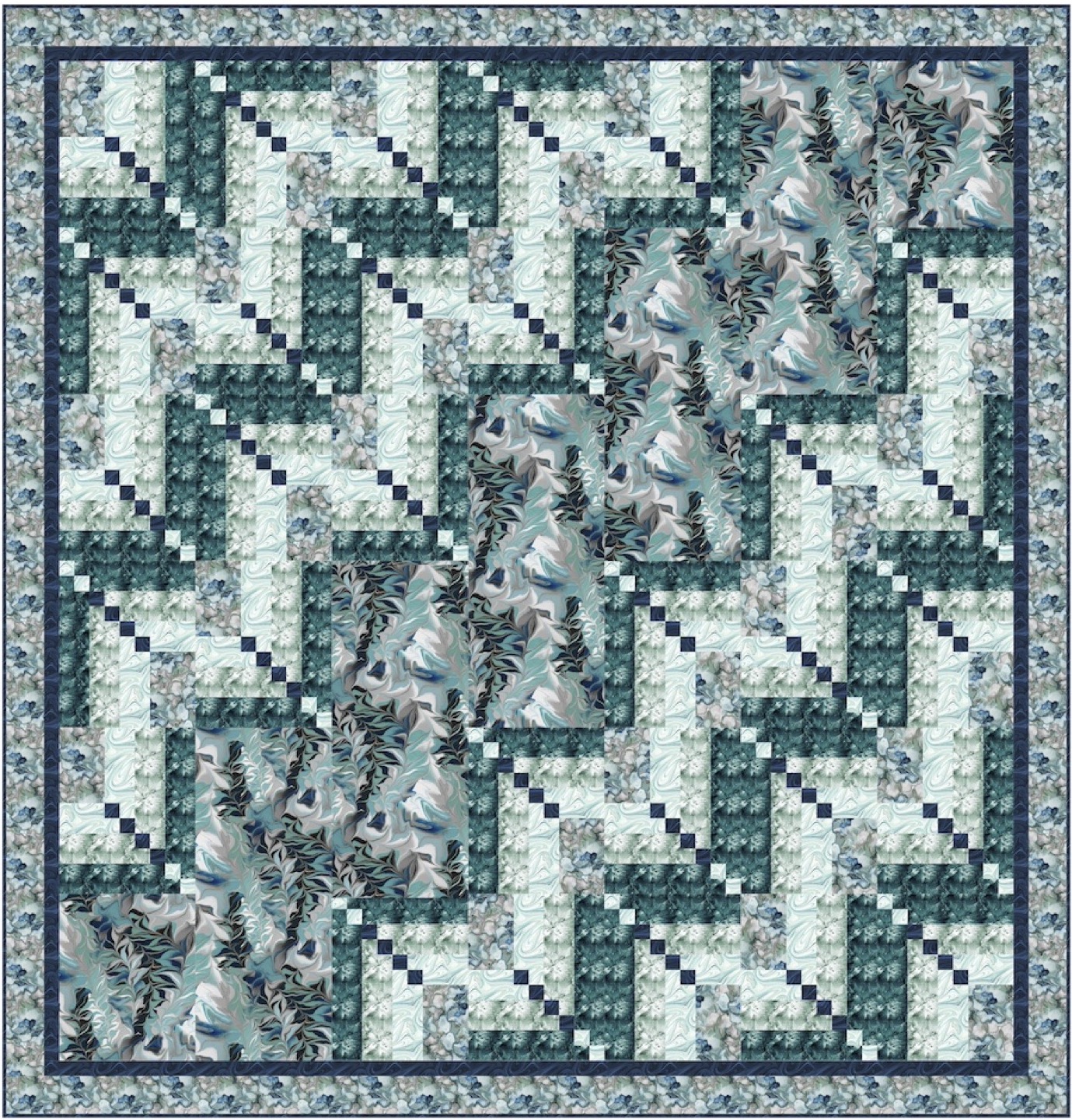 70″ x 73″. Strip sets and rectangles make the blocks. Set them together with large rectangles. So easy. Fabrics from the Virtuoso collection from QT Fabrics. Skill Level: Confident Beginner