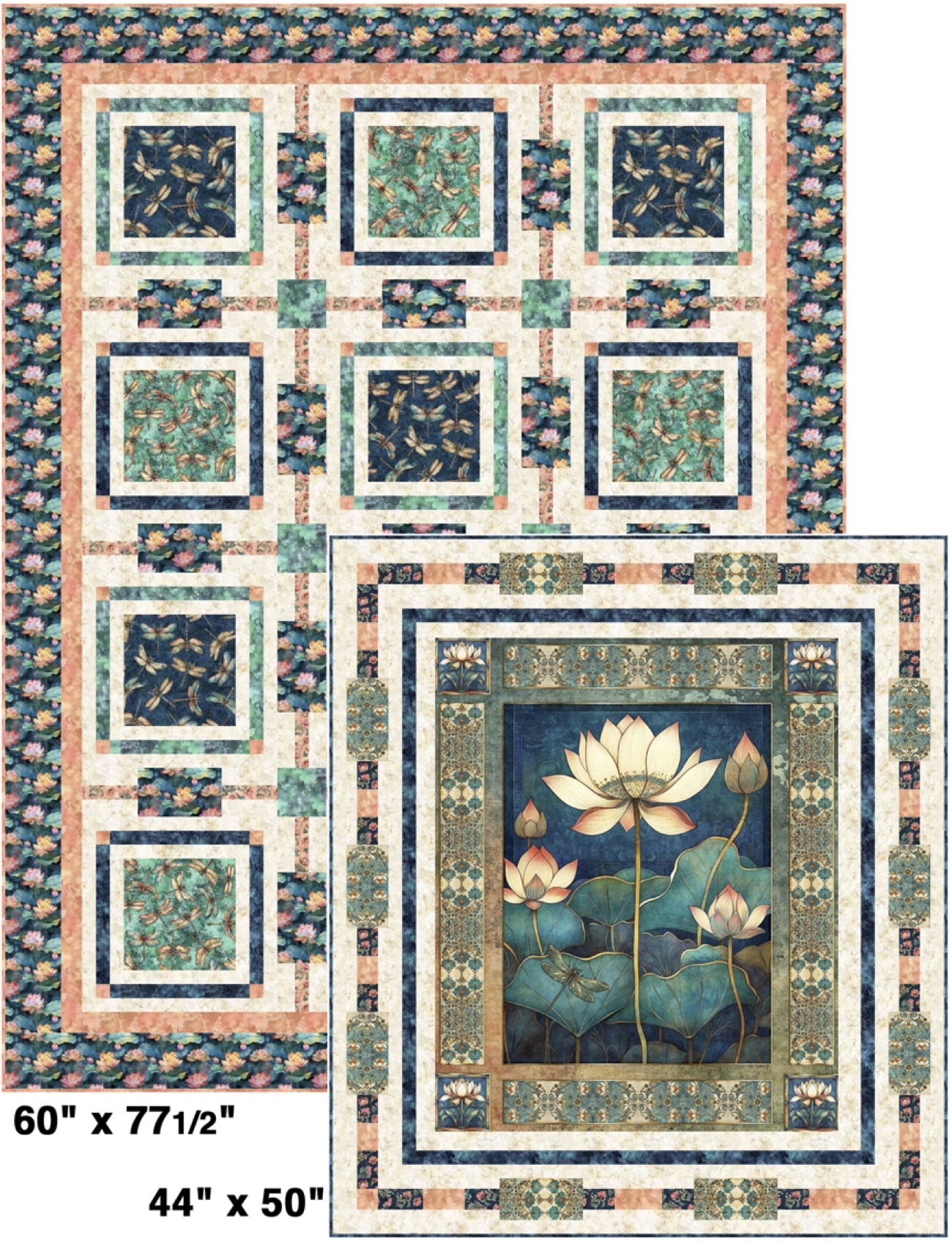 Throw: 60″ x 77 1/2″; wall: 44″ x 50″. Strip segments make all the units for these quilts. Easy to put together. Large pieces. No seams to match. Fabrics from the Serenity collection by QT Fabrics. Skill level: confident beginner.